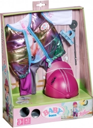 Ezenkívül tartalmaz kiegészítőket, mint például ostor és lóápoló kefe. Az öltözet alkalmas a Star Sisters BABY born babák és más 43 cm-es babák számára is.