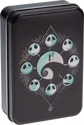 Fekete fémdoboz Jack Skellington és Sally mintával, ideális a tároláshoz és biztonságban tartja a kártyáit.