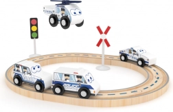 A készlet összesen 16 darabot tartalmaz, köztük síneket és rendőrségi járműveket, amelyek könnyen összeilleszthetők és bővíthetők más fa játékszettekkel.