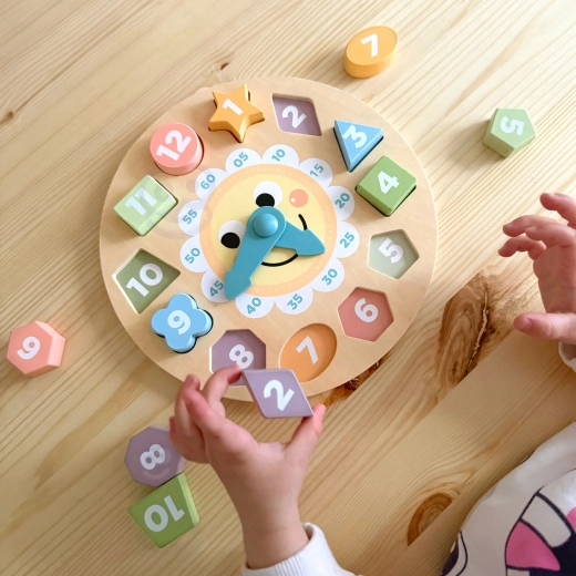 A TOOKY TOY fa oktató óra ötvözi a formaberakó kirakót az időmeghatározás első lépéseivel. A különböző alakú, színes elemek 1–12-ig számozva a megfelelő nyílásokba illeszthetők, miközben a kék, mozgatható mutatók az órák és percek gyakorlására hívnak. A középen mosolygó napocska és a kellemes pasztellszínek felfedezésre és koncentrált játékra ösztönöznek.