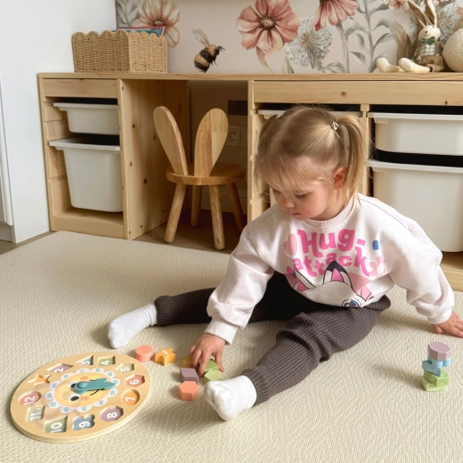 A különböző alakú és színű, kivehető fa elemek segítik a gyerekeket a formák, színek és számok felismerésében, és támogatják a pontos illesztést és a türelmet.