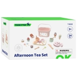 Ez a minőségi fa édességkészlet mindent kínál egy stílusos délutáni teázáshoz: szeletelhető tortát, roládot, fánkot, kekszeket, makaronokat és fagyit. A gyerekek gyakorolják a finommotorikát a szeletelés és a tálcán való elrendezés közben, valamint fejlesztik a fantáziát és a kommunikációt a cukrászdás vagy teázós szerepjáték során.