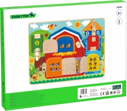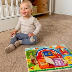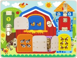 Ez a minőségi fa tábla 6, zsanérokon nyíló ablakot kínál különböző mechanizmusokkal – a klasszikus reteszektől a láncokig és kampókig. A gyerekek ujjgyakorlata, összpontosítása és türelme is fejlődik, miközben minden zárat kinyitnak és bezárnak, hogy felfedezzék a kedves állatképeket.