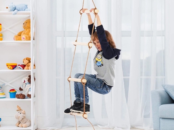 Gyermek fa kötélhágcsó kertbe. Biztonságos, sima fokok, erős kötelek, könnyű szerelés, 190 cm hossz, 50 kg teherbírás. Szabadtéri mozgás és szórakozás.