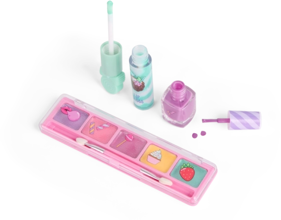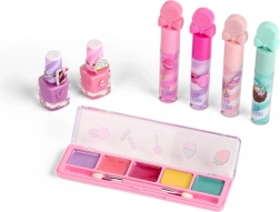 A szett öt szemhéjpúdert applikátorral, négy ajakfényt, két körömlakkot és két gyűrűt tartalmaz stílusos kiegészítőként. Szuper ajándék, bulikra és mindennapi játékhoz egyaránt.