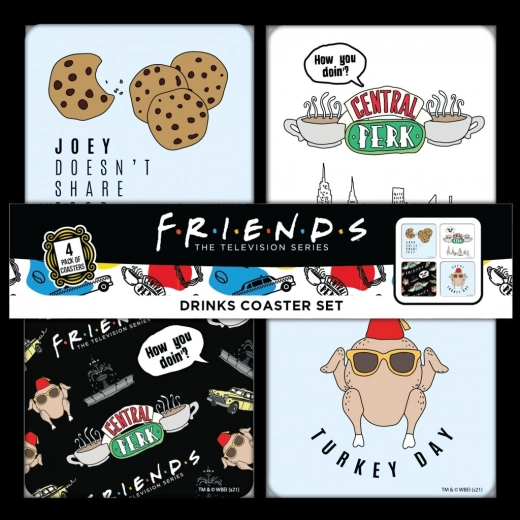 A „Barátok” poháralátét szett ideális az asztal védelmére a foltoktól és a karcolásoktól. A készlet négy parafa alátétet tartalmaz, mindegyik a kedvelt „Jóbarátok” sorozat egyedi motívumával. Az alátétek nemcsak praktikusak, hanem divatos kiegészítők is az otthonodba.