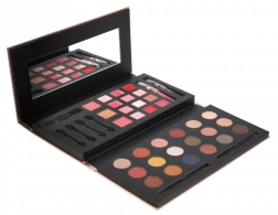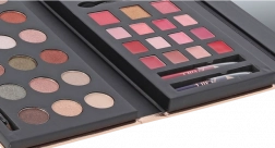 A Glam To Go kozmetikai paletta ideális minden nő számára, aki szeretné, ha minden sminkterméke együtt lenne egy elegáns csomagolásban. Tartalmaz 18 szemhéjfestéket, 12 krémes rúzst és további kozmetikai eszközöket.