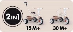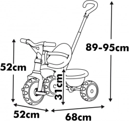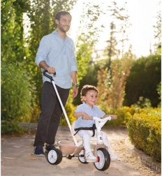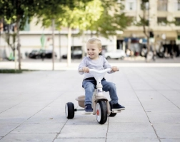 A biztonság és a komfort érdekében a tricikli biztonsági övvel, csúszásgátló pedálokkal a tekerés zárolási lehetőségével, valamint ergonomikus, két pozícióba állítható üléssel rendelkezik. A csendes kerekek kellemes használatot biztosítanak városban és parkban egyaránt, a felnyitható műanyag kosár pedig helyet ad a játékoknak és az apróságoknak.