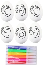 - Minden egy csomagban – 6 tojás + 6 színes filc (sárga, narancs, piros, kék, rózsaszín, zöld).
