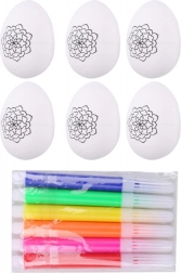 Ez a szórakoztató készlet mindent tartalmaz, amire a gyerekeknek szükségük van egyedi húsvéti tojások készítéséhez. A tojások simára csiszolt, fehér felületűek, készen állnak festésre, kihúzásra és továbbdíszítésre. A mellékelt hat színű filctollal a gyerekek azonnal alkothatnak és fejleszthetik kreativitásukat.