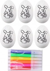 A készlet 6 tojást és 6 színes filctollat tartalmaz – sárga, narancs, piros, kék, rózsaszín és zöld – így azonnal nekiláthat. Az alkotás támogatja a finommotorikát, a kéz–szem koordinációt és a gyermeki fantáziát.