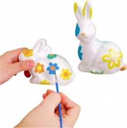 A készlet három polisztirol nyuszit és két polisztirol tojást tartalmaz. Négy intenzív szín és egy ecset is része a csomagnak, amelyek lehetővé teszik a könnyű és precíz festést.