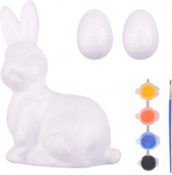 E kreatív készletben található egy polisztirol nyuszi és két polisztirol tojás. A mellékelt intenzív árnyalatú festékek és ecset segítségével a festés könnyű és élvezetes tevékenység. Ez a készlet fejleszti a kreativitást és a kézügyességet, lehetővé téve egyedi díszek elkészítését a húsvéti asztalra, koszorúkra vagy kosarakba. A kész figurák csodálatos részévé válnak az ünnepi hangulatnak, amely különleges tavaszi érzést ad az otthonnak.