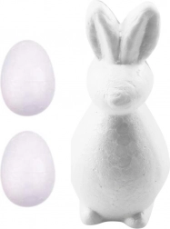 A készlet tartalmaz egy polisztirol nyulat és két tojást (nagyobb és kisebb) négy intenzív színnel és egy ecsettel. Ezek a figurák könnyű és tartós polisztirolból készültek, ami biztosítja a könnyű díszítést és a sérülésállóságot. Festés után húsvéti dekorációként használhatja őket asztalon, kosárban vagy a belső térben.
