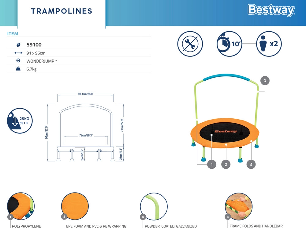 A trambulint néhány perc alatt, szerszámok nélkül össze- és szétszerelheti. A kompakt kialakítás ideális kis lakásokhoz és gyors elpakoláshoz.