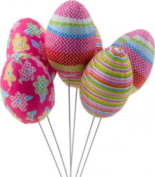Húsvéti dekoratív tojásaink pálcikán tökéletes választás egyedi, ünnepi dekoráció létrehozásához. A készlet 2 pöttyös, 2 csíkos és 2 virágmintás tojást tartalmaz. A tojások könnyű és ellenálló sztiroporból készültek, és rugalmas huzalaiknak köszönhetően könnyen elhelyezhetők különböző dekorációkban.