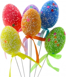 A színes húsvéti tojások dróton ideális díszítések az otthonodba húsvéti ünnepek idején. Minden tojás gondosan díszített habgyöngyökkel és finom mintákkal, amelyek különleges jelleget adnak nekik. A rugalmas drótnak köszönhetően bárhová könnyen elhelyezhetők.