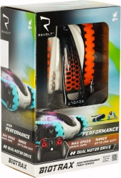 A kompakt RC lánctalpas jármű, a REVOLT BIOTRAX futurisztikus dizájnnal, strapabíró felépítéssel és zökkenőmentes vezérléssel a 2,4 GHz-es frekvencián nyűgöz le. A gumilánctalpnak köszönhetően megbirkózik a szőnyeggel és a kerttel is, a távirányító hatótávja kb. 20 m, a sebesség pedig akár 8 km/óra. A beépített LED világítás látványos effektet ad a menetnek, a 8 évesnél idősebb gyerekeknek pedig rengeteg akciót kínál.