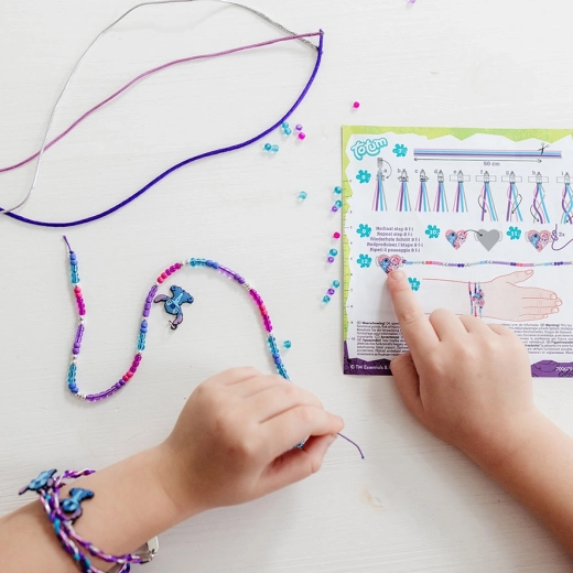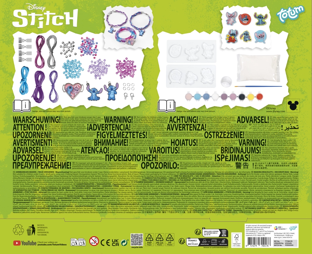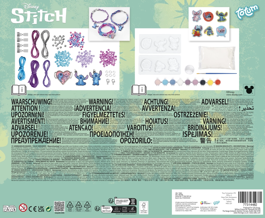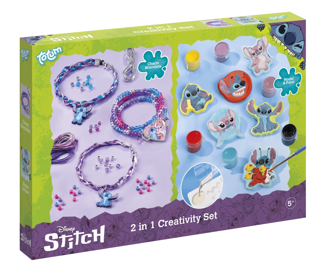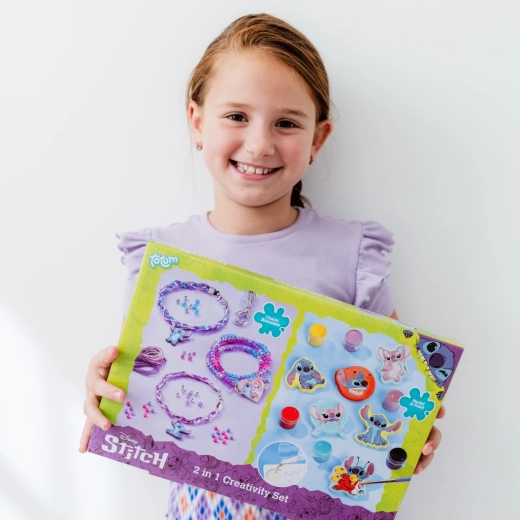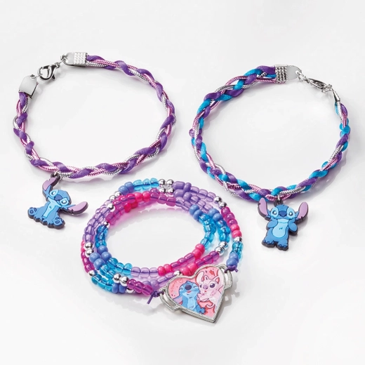 Ez a sokoldalú kreatív készlet két kedvelt tevékenységet egyesít – a ékszerkészítést és a festést. A gyerekek könnyedén elkészíthetnek akár három karkötőt: kettőt szatén zsinórokból élénk színekben, és egy gyöngykarkötőt üveg- és fémesen csillogó gyöngyökkel. Díszítsék prémium gumimédálokkal STITCH-csel, valamint egy nagy szívecske medállal STITCH és ANGEL motívummal.