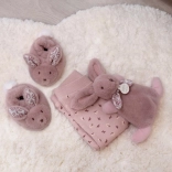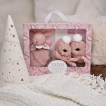 Ajándékozzon puhaságot és biztonságot ezzel a csodálatos készlettel. A plüss nyuszi elegáns masnival nyugalmat hoz és támogatja a csecsemők érzékszervi fejlődését. Hosszú fülű cipők melegen tartják a lábakat a hőszigetelő anyagnak köszönhetően, és elején nyusziarc van hímezve.