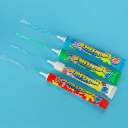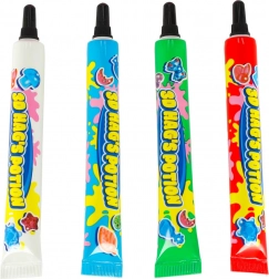 A készlet négy kis tubus ragasztót tartalmaz különböző színekben, valamint formákat különböző mintákkal.