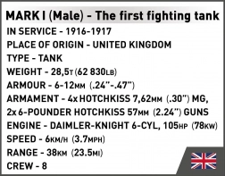 Építsd meg a Nagy Háború páncélozott úttörőjét. A részletgazdag COBI Mark I (Male) építőkészlet 1:35 méretarányban autentikus álcázást, pontos arányokat és kiváló, nem kopó nyomatokat kínál. A modell játékra és kiállításra egyaránt kiváló, ráadásul oktató értéket is hordoz a történelemhez és a The Tank Museumhoz fűződő kapcsolata révén.