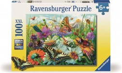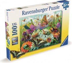 A puzzle részletes illusztrációkat tartalmaz különböző rovarfajokról, amelyeket színes virágok vesznek körül, ezzel lenyűgöző látványt nyújtva a biodiverzitásra.