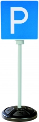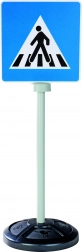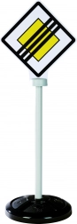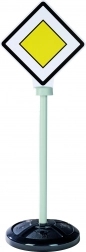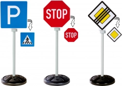 A készlet három stabil táblát tartalmaz, mindegyik kétoldalas nyomtatással, összesen öt valósághű közlekedési szimbólummal: STOP, főút, főút vége, parkoló és gyalogos átkelő.