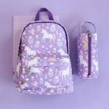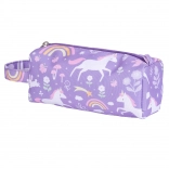 Lila tolltartó ceruzák, filctollak vagy íróeszközök számára, egyszarvú, virág és szivárvány motívumokkal, fenntartható poliészterből készült. Ideális iskolába, utazáshoz vagy szakkörökhöz, cipzárral záródik, és kényelmes fogantyúval rendelkezik a könnyű hordozás érdekében. Biztosítja íróeszközeinek biztonságos tárolását.