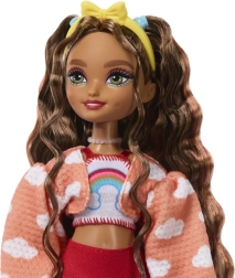 Hosszú, hullámos barna haj fejpánttal és masnival, szivárványos crop top, felhős kardigán és piros szoknya – mind könnyen kombinálható és levehető.