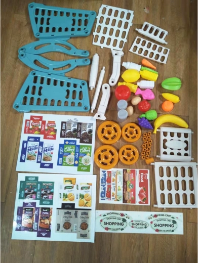 A gazdag tartozékkal ellátott gyermek bevásárlókocsi örömet szerez minden kis boltosnak. A készlet része 56 darab élelmiszer és egy képes útmutató az egyszerű összeszereléshez. A stabil kivitel és a 40 × 24,5 × 44 cm-es méret ideális az otthoni és útközbeni játékhoz.