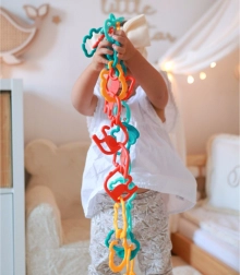 A puha műanyag láncszemek kímélik a baba ínyét, és kényelmesen illeszkednek a kis kezekbe – ideális segítség az első fogak kibújásakor.