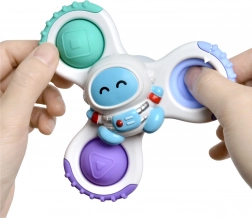 A Woopie gyerek pörgettyű készlet űrtémát kínál rakéta, űrlény és UFO motívumokkal. Ezek a műanyag játékok ideálisak a különböző környezetekben való játékhoz. A pörgettyű gumi elemekkel rendelkezik, amelyek serkentik az érzékelés fejlődését. A tapadókorongoknak köszönhetően a játékok könnyen rögzíthetők különböző felületeken, ami ideális utazás közben vagy fürdéskor a kádban. A csapágyak rugalmassága zökkenőmentes és tartós mozgást biztosít.