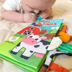 A kiálló puha farkincák és a zörgő elemek felfedezésre hívnak, fejlesztik a tapintást és a hallást, és ösztönzik a gyerekeket a megfogásra és az oldalak lapozására.