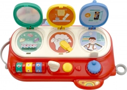 Ez az okos fejlesztőjáték három ablakot tartalmaz, melyek mindegyike másképp nyílik – szimbólumok kombinációjával, kulccsal vagy gombbal és forgatható vezérlővel. Belül különféle meglepetések várnak: kihúzható „kendők”, fogacskás kép mozgatható fogkefével, valamint egy figura forgatható ruhaválasztóval. Minden mozdulatnak egyértelmű eredménye van, ami segíti az ok–okozat megértését.