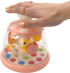 A nagy felső gomb ideális a kis kezekhez. Egyetlen nyomásra megpördülnek az állatkák és a golyók, és lenyűgöző mini körhinta jön létre.