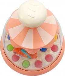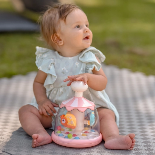 Fedezd fel az egyszerű interaktív játék varázsát: elég megnyomni a nagy felső gombot, és az átlátszó kupola mini körhintává változik állatkákkal és vidáman pattogó golyócskákkal. A gyerekek élvezik a színes effekteket, a mozgást és a finom hangokat, amelyek természetesen fejlesztik az érzékszerveket.
