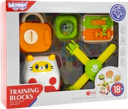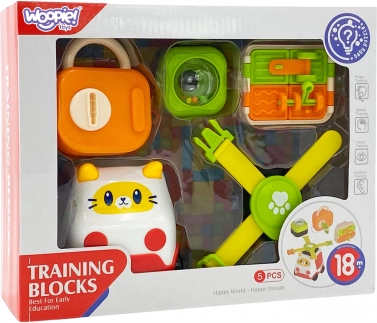 A készlet 4 interaktív kockát tartalmaz: narancssárga zárat kulccsal a fogás és koordináció fejlesztésére, reteszes és tolózáras ablakokat az ok–okozat felfedezéséhez, forgó elemet golyókkal vizuális stimulációhoz és csatos, hurkos pántokat, amelyek légcsavarra emlékeztetnek, a bekapcsolás gyakorlásához. Minden elem masszív és biztonságos anyagból készült, kisgyermekek számára alkalmas.