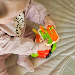 A színes golyókkal teli forgó rész támogatja a vizuális követést, míg a csatos pántok a bekapcsolás gyakorlásával fejlesztik az ujjak ügyességét.