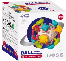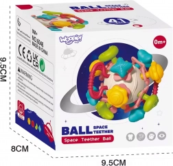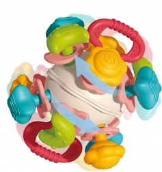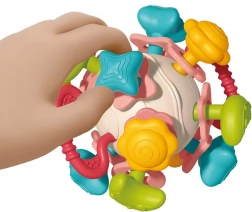 A színes WOOPIE érzékszervi labda egyesíti a csörgőt, rágókát és fejlesztő manipulációs játékot egyben. A gyöngyökkel ellátott forgó karikák finom kattogó hangot adnak, a puha gumis fogófelületek kellemesek a kis kéznek, a biztonságos, éles szélektől mentes kialakítás pedig ösztönzi a finommotorikát, a kéz–szem koordinációt és a baba összes érzékszervét.