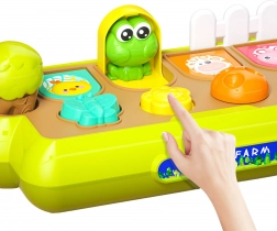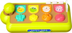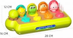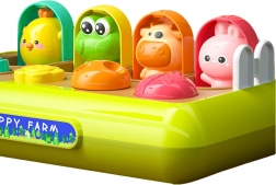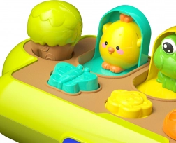 A WOOPIE BABY felbukkanó állatfarm egyesíti a szórakozást és a tanulást. Minden állat a megfelelő műveletre – lenyomás, elfordítás vagy elcsúsztatás – ugrik elő. A gyermek játékosan fedezi fel a körülötte lévő világ működését, miközben fejlődik a kéz-szem koordinációja.