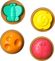 Színes elemek, eltérő formák és mechanikák támogatják a tapintást, a látást és az apró ujjak mozdulatainak pontosságát.