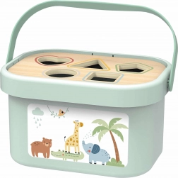 A formakivágásokkal ellátott fedél segít a gyerekeknek válogatni és felismerni a formákat és színeket. A darabok játék után a dobozba tehetők, amely praktikus fogantyúval kényelmesen hordozható.