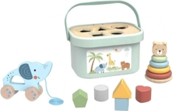 Ez a sokoldalú készlet játékos módon támogatja a gyerekek fejlődését: a gyerekek formákat válogatnak a válogatófedélbe, színes karikákat raknak a macis piramis pálcájára, és a húzható elefánttal gyakorolják a járást és a koordinációt. Játék után minden a zárható, füles dobozba kerül, így pillanatok alatt rend lesz.