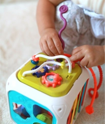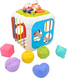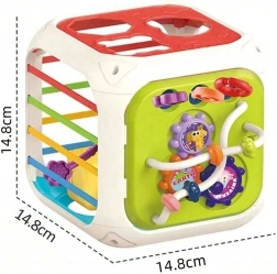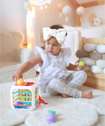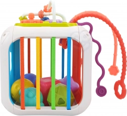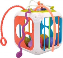 A kocka minőségi ABS műanyagból és szilikonból készült, strapabíró és biztonságos a kis kezek számára. A csomag részei a válogató kockák rejtett csörgőkkel, amelyek a hangokkal, formákkal és színekkel való kísérletezésre ösztönöznek. A levehető felső rész bővíti a játék lehetőségeit – a gyermek önállóan is használhatja alátéten vagy babakocsiban.