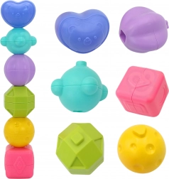 A behelyezhető formák rejtett csörgőkkel motiválnak az ismételt próbálkozásra. Támogatják a formák és színek felismerését, és erősítik a szem–kéz koordinációt.