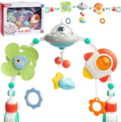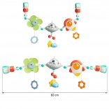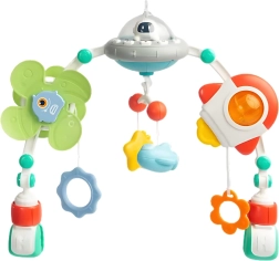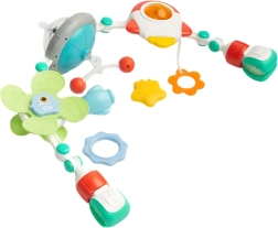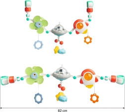 A sokféle függő elem reagál az érintésre, támogatja a finommotorikát, a koordinációs készségeket, valamint az ok–okozat megértését. Néhány játék biztonságos rágókaként is használható. A gyermekbarát, minőségi anyagok és a könnyű rögzítés praktikus mindennapi segítséggé teszik az ívet.
