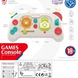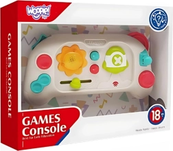 A WOOPIE interaktív vezérlője kíváncsi kis kezek számára készült, 18 hónapos kortól. A színes gombok forognak, kattognak és dallamokat játszanak, a világító „nap” felkelti a figyelmet, a mozgó rakéta pedig kreatív játékra hív. A fények, hangok és tapintási ingerek kombinációjával a gyerekek fejlesztik érzékszervi észlelésüket és a finommotorikát.