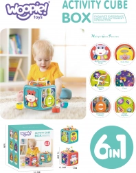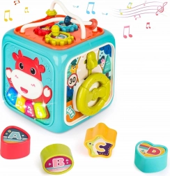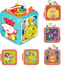 A zenei funkciók mellett a kocka formabedobót 4 formával és betűkkel, forgatható órát, fogaskerekeket, kormánykereket kis autóval és golyós labirintust tartalmaz. A masszív műanyag, lekerekített élek és a nem toxikus festékek biztonságos játékot biztosítanak már az első hónapoktól. Tápellátás: 3× AA (nem tartozék).