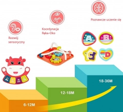 A WOOPIE interaktív szenzoros kocka változatos szórakozást és tanulást nyújt egyben. A gyermek különféle textúrákat, formákat és hangokat fedez fel, megtanulja felismerni a színeket, és gyakorolja a fogást, a nyomást és a forgatást. A DO, RE, MI, FA billentyűkkel ellátott zenei panel öt üzemmódot, fényhatásokat és több tucat dallamot kínál, amelyek ösztönzik a hallás és a ritmus fejlődését.